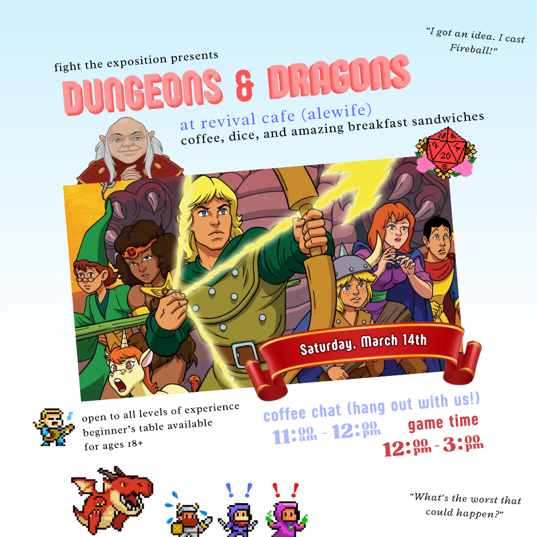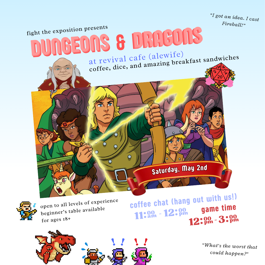 Fight The Exposition is an AAPI-owned small business founded by Joshua Do in March 2023. Our aim is to provide the best Dungeons & Dragons experience to the Greater Boston region, as our belief is that the shared adventures in the game offer a once-in-a-lifetime opportunity. We pride ourselves on running excellent games and creating a safe, inclusive space for all our players.